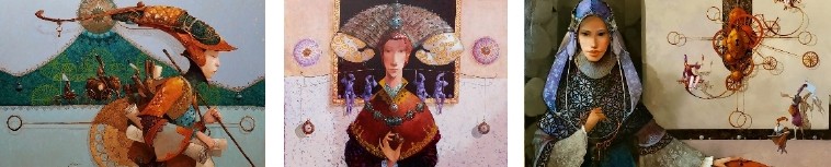 Over het werk van Merab: “Merab interpreteert verhalen en legenden uit zijn land, een land dat Europese en Oosterse invloeden heeft ondergaan. De schilderijen nemen je mee op een denkbeeldige reis met personages die zich bevinden op een kruispunt van dromen en realiteit.”
