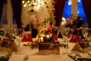 De tafels waren prachtig gedekt, brandende kaarsen op tafel, gevulde wijnglazen…..De grote zaal van Theater Concordia ia was ongelofelijk sfeervol in kerststemming gebracht! Wit tafellinnen en glanzende versieringen schitterden! Meer dan 80 gasten aten aan ronde tafels een heerlijk diner met tussen …