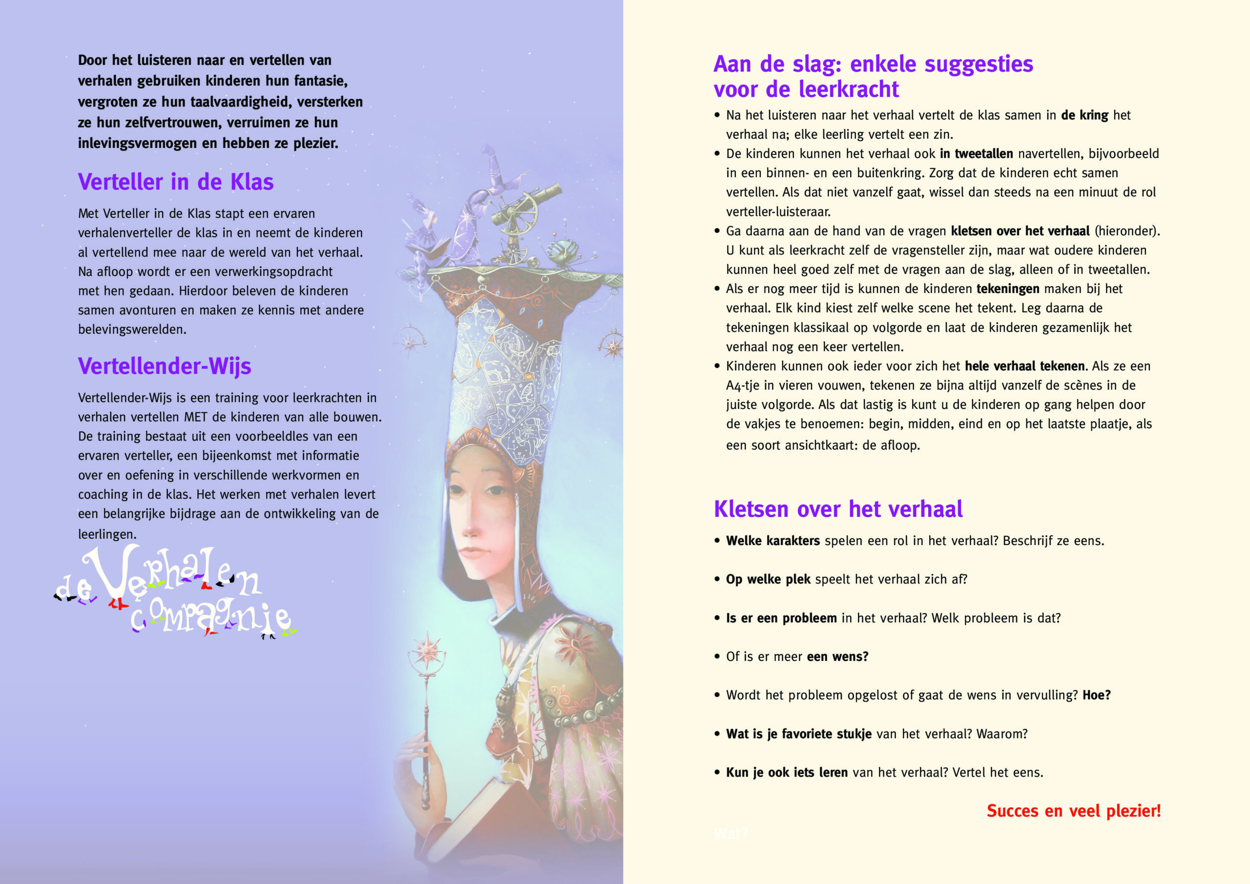 Het is niet alleen waardevol dat kinderen luisteren naar de prachtig vertelde verhalen, maar we vinden het ook belangrijk dat ze actief aan de slag gaan met de verhalen. Daarom heeft de Verhalencompagnie meerdere lesbrieven ontwikkeld. Hierin staan praktische tips waarmee leerkrachten kunnen voortborduren op het verhaal dat door de vertellers in de klas verteld is. De lesbrief “Fantasie is een spier die je kunt trainen” gaat over kinderen leren zich uit te drukken over wat ze denken en ervaren: geuren, kleuren, aanrakingen, geluiden, enz. Deze lesbrief is gerealiseerd met financiële hulp van Streekfonds Krimpenerwaard.